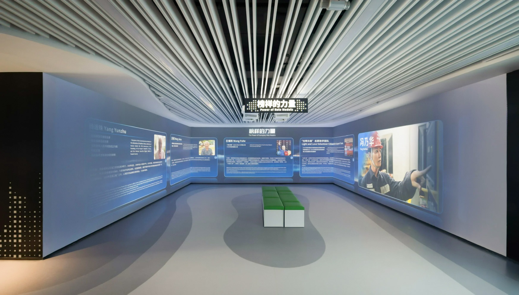 主展区沿墙面布置数字展项,融合层叠巨浪的造型,形成通厅式布局,弱化参观动线限制。内浅外深的配色既平衡了数字展项的冷峻感,又营造出会客厅般的舒适氛围。